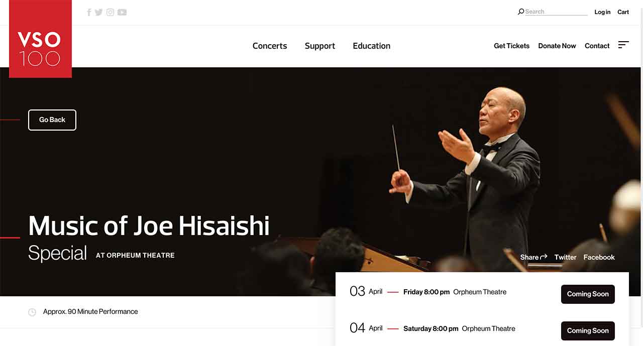 久石譲さんのコンサートは『Music of Joe Hisaishi – Vancouver Symphony Orchestra』からすることができます。